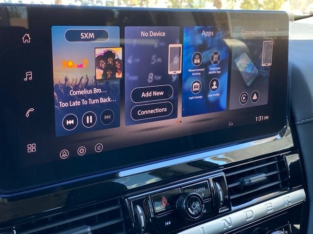 - Radio: AM/FM Audio System w/NissanConnect -inc: 6 speakers, 5G Wi-Fi hotspot, wireless Apple CarPlay and Android Auto, 12.3" center touch-screen display, SiriusXM satellite radio, 2 front USB connection (1 type C charge and data ports), Bluetooth® hands-free phone system, streaming audio and messaging and hands-free text messaging assistant